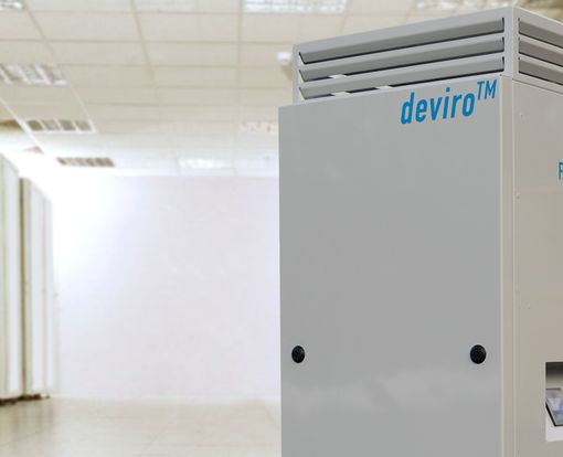 The deviro™ cleans room air of fine dust, viruses and other elements that are harmful to health using a three-phase filtration system. The downstream HEPA H14 filter removes 99.995% of impurities from the air. Despite its powerful fan, the deviro™ is one of the quietest filtration devices in its class and can therefore also be used in work rooms.